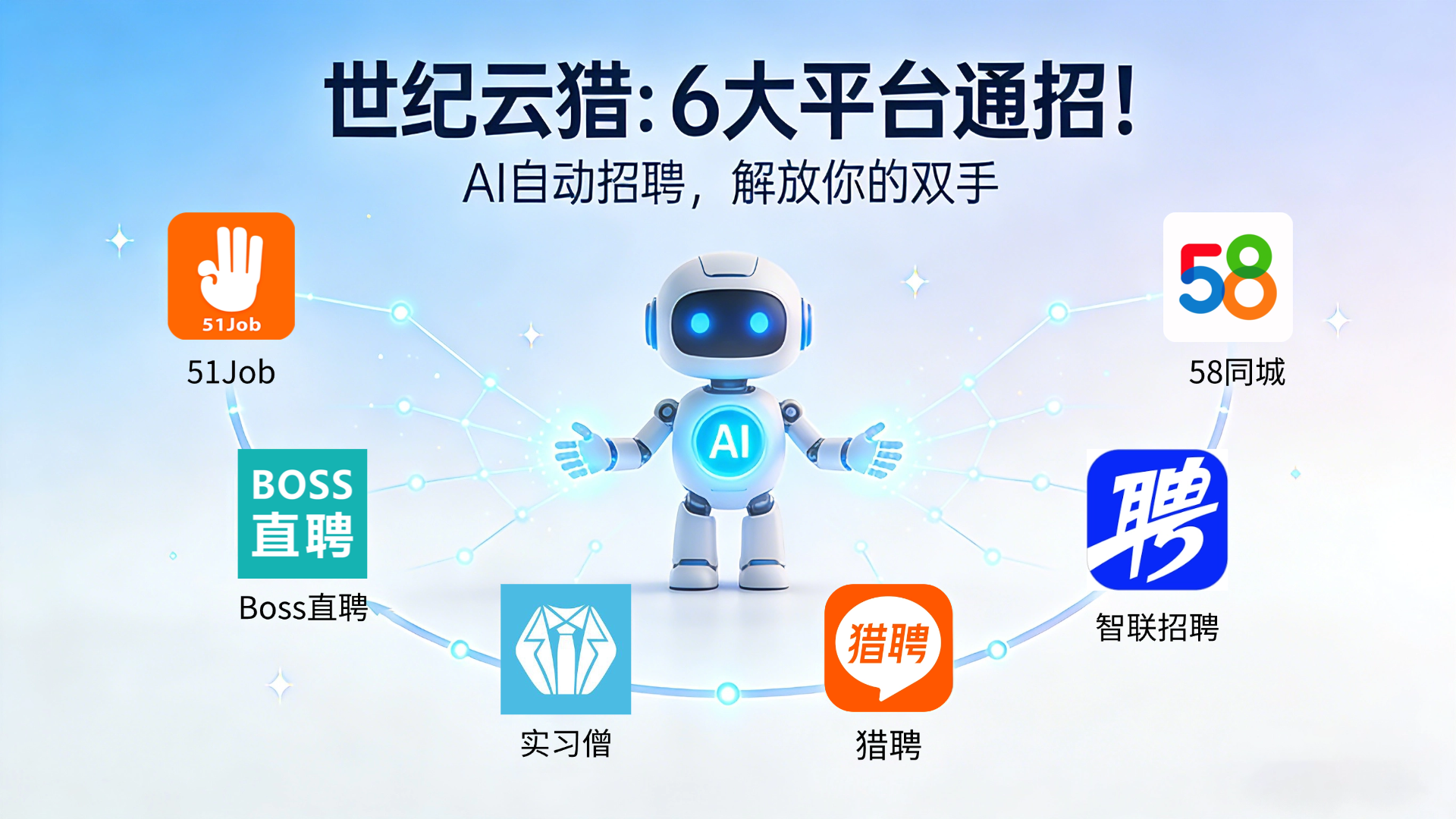 集成 BOSS直聘、猎聘、51job、智联等主流平台,全天候模拟人工寻找优质候选人。
